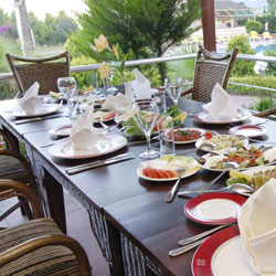 صبحانه، ناهار و شام در فضای سرپوشيده با گنجايش ٣٠٠ صندلی و در فضای روباز با گنجايش ٣٥٠ صندلی سرو می شود. همچنين می توانيد از بوفه باز با سرويس all inclusive (صبحانه، ناهار، عصرانه، شام و نوشيدنی های ترکی از صبح تا ساعت ١١ شب رایگان) استفاده کنيد.