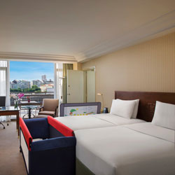 این اتاق های 100 متر مربعی دارای چشم انداز به شهر، بالکن، میز کار و دسترسی به اینترنت بی سیم رایگان می باشند. در فضای کاری اتاق می توانید از میز طالعه به همراه دسترسی به اینترنت بی سیم رایگان و کانال های چند زبانه در تلویزیون ال سی دی استفاده کنید. اتاق فمیلی دو حمام و دو اتاق خواب دارد که در یکی از آنها یک تخت خواب کینگ (دو نفره بزرگ) و در اتاق خواب متصل دیگر دو تخت خواب توئین قرار گرفته است. امکاناتی که برای راحتی و امنیت میهمانان در نظر گرفته شده اند شامل سیستم تهویه مطبوع، رادیوی زنگدار، حوله لباسی، بیده (شیر مخصوص طهارت)، پرده های ضخیم ضد نور، بالشت های پر قوی ضد حساسیت، عدم استعمال دخانیات، بسته شدن خود به خود درب، درب های دارای دو قفله، قفل های الکترونیکی، سیستم تشخیص دود الکترونیکی، دکمه تماس با ضروریات بر روی تلفن، گاوصندوق، چشمی هایی با زاویه دید زیاد، نظافت 24 ساعته اتاق، وسایل حمام، خروجی های مناسب (در هنگام خطر)، روم سرویس (سفارش غذا و نوشیدنی از داخل اتاق) عصرانه، سشوار، دوش، دسترسی به اینترنت، اتو و میز اتو، مینی بار، مبلمان و تخت خواب اضافی، امکانات تهیه چای و قهوه، سیستم بیدارباش تلفنی، تلفن های دو خطه، دو عدد تلفن، تلفن دارای پیام صوتی، تلفن در داخل حمام و تلفن دارای اسپیکر می باشند. این اتاق ها مناسب اقامت حداکثر 5 میهمان بزرگسال هستند.